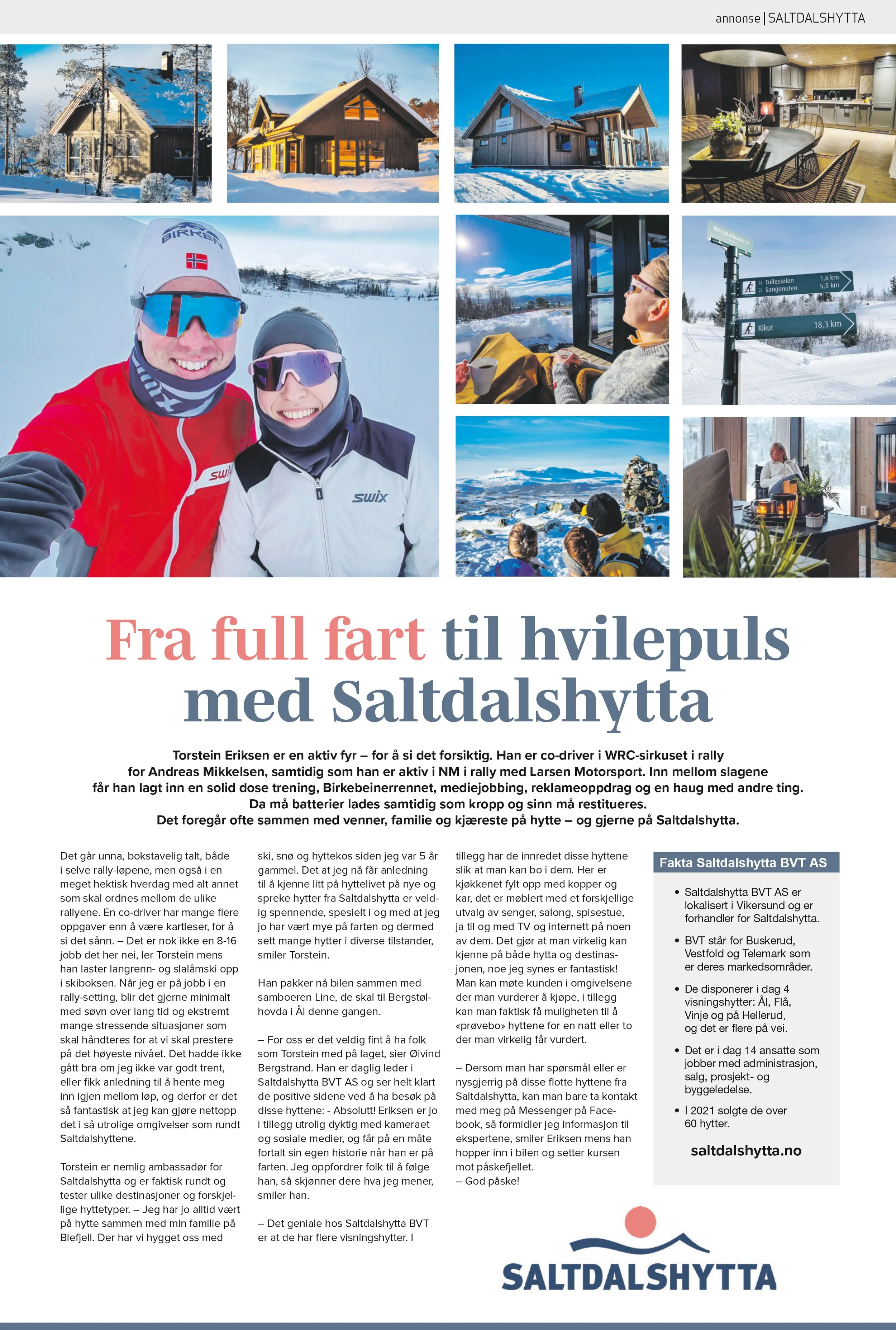 Vi gratulerer Torstein og Line med kjøp av tomt nr 15 på Bergstølhovda hyttegrend. Torstein Eriksen har en helt spesiell jobb. Han er kartleser både nasjonalt og internasjonalt i rally. Det betyr at dagene hans går fra å være ekstremt hektiske til meget rolige. Det vil si rolige: Torstein og Line har en rimelig aktiv livsstil, så det er mye reising, mye natur, ski, fjell, fjord og sjø! Og nå skal de etterhvert realisere hyttedrømmen på Bergstølhovda. Etter at de har sett, og testet, mange ulike hytter og områder, blir det altså Bergstølhovda.